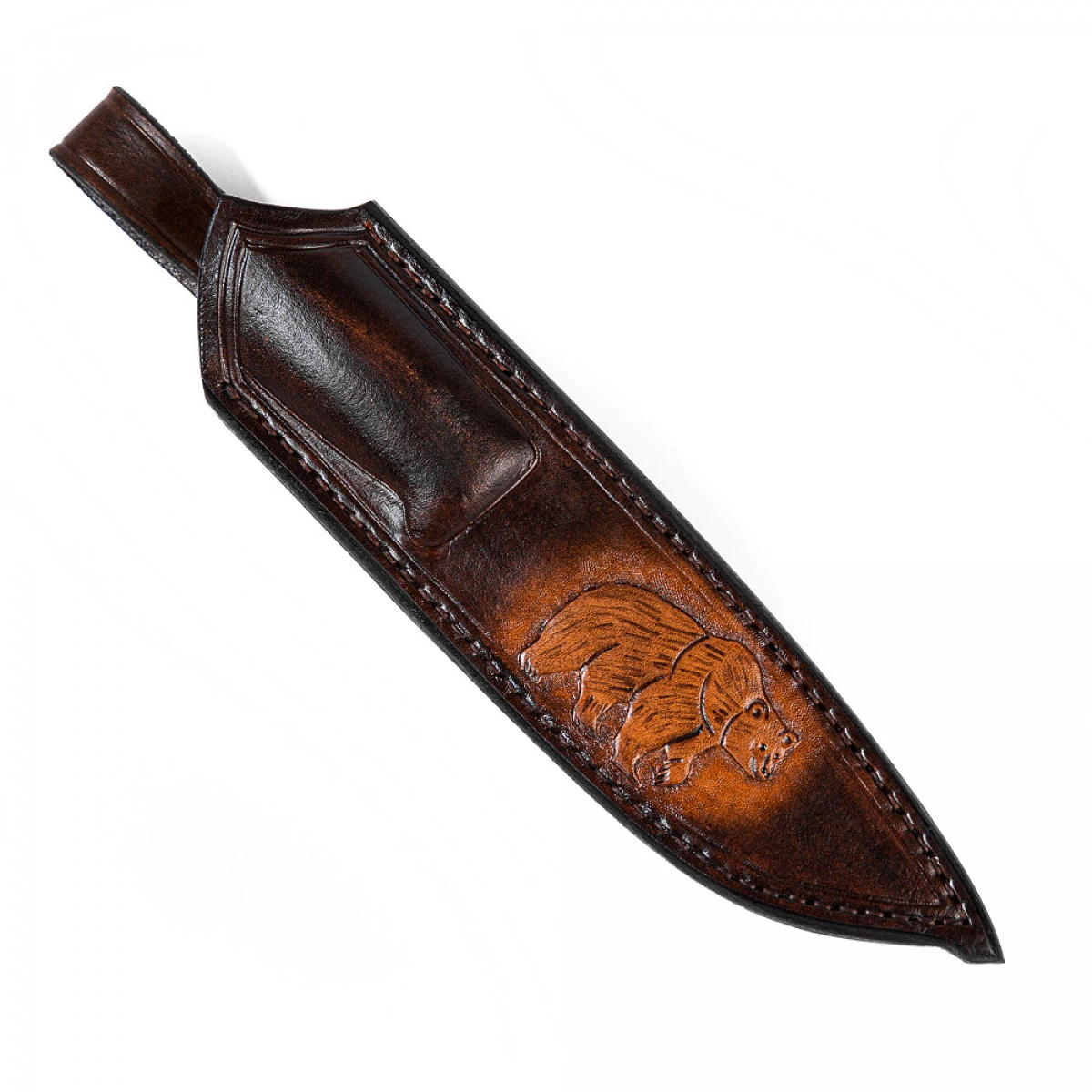 Ножны формованные под рукоять ножа со стильным тиснением «Медведь». Выполняются из кожи растительного дубления, покрашены, покрыты водоотталкивающим финишем. Подвес двойной жесткий и свободный на клёпках. Их можно преподнести в подарок коллекционеру, любителю охоты, рыбалки, походов в лес и горы. Чехол надежно защищает лезвие от повреждений и вредных факторов внешней среды. Натуральная кожа прослужит вам много лет.